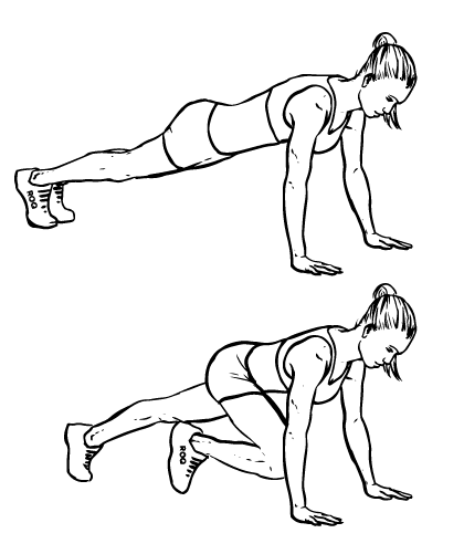 Start in a press-up position with your hands shoulder width apart directly under your shoulders. Pull your right knee towards your left shoulder without letting it touch the floor and return to the start position. Repeat with your left leg. Complete as quickly as you can whilst keeping your core engaged and maintaining control.