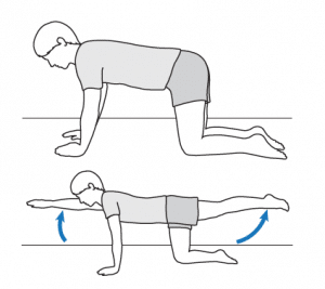 Start on all fours with your hands directly under your shoulders, and knees directly under your hips. Keeping your core engaged raise one arm and the opposite leg away from you, hold for 5 seconds before returning to the starting position. Complete on the other side
