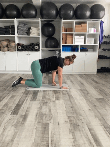 Start on all fours in a neutral table-top position (Shoulders over wrist, and hips over knees) Tuck in your chin and make sure your back is flat.